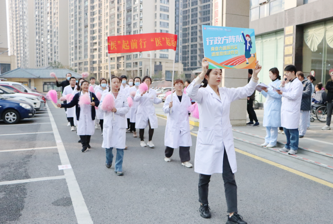 接着,来自医生方阵队、护士队、康复队、中医/医技队、行政队5个方阵代表队身着统一的服装,迈着整齐的步伐,高喊响亮的口号,通过主席台,接受院领导的检阅。