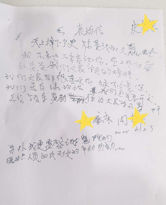 6月24日,无锡国济康复医院十七病区迎来了一份特别的礼物——一封饱含深情的手写感谢信。患者周某某用一笔一划的质朴文字,书写下自己在医院被专业与温情环绕的康复之旅。信中“天上掉下个史芙荣,你是我的大恩人”的真诚倾诉,以及“若有缘,还是万年交”的深情邀约,如同一束温暖的光,照亮了医患之间深厚的情谊。这封信,不仅是对个别医护人员的诚挚感谢,更彰显了多学科医疗团队在复杂病情面前的紧密协作,以及医患之间相互理解、携手前行的温暖力量。