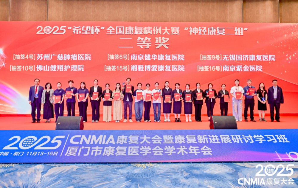 近期,2025年中国非公立医疗机构协会康复医学专业委员会主办的“希望杯”全国康复病例大赛总决赛在厦门圆满落幕。经过多轮激烈角逐,无锡国济康复医院康复医学科团队凭借扎实的专业功底、创新的康复理念及精彩的病例汇报,从全国百余支参赛队伍中脱颖而出,荣获总决赛二等奖,为医院赢得了崇高荣誉,彰显了我院康复医学领域的过硬实力。