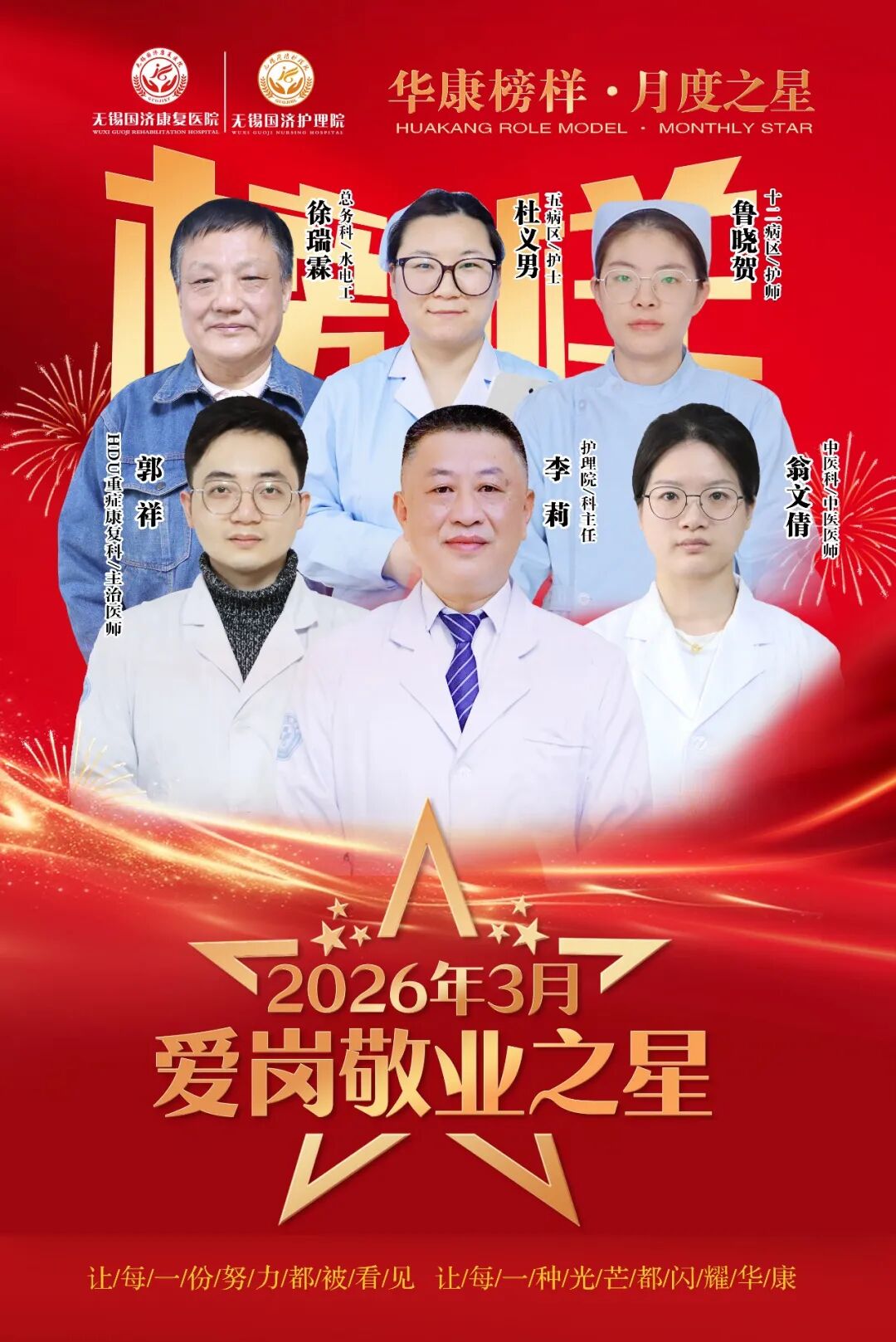 2026年作为东方华康医疗集团 “三年服务内涵行动” 深化之年,深耕服务本质、坚守职业初心成为全体华康人行动指引。经集团及医院层层评比,我院3月 “华康榜样・月度之星”—— 第一期 “爱岗敬业之星” 评选结果正式揭晓。六位获奖职工来自临床、护理、后勤等不同岗位,他们以躬身实干诠释责任,用点滴坚守践行初心,在平凡岗位上守护患者健康、保障医院运转,绽放不平凡的职业光彩,成为全体职工学习的榜样。